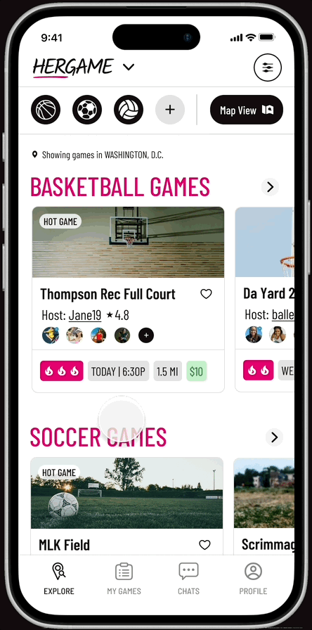 HerGame was born from a common frustration for women in recreational sports: wanting to play, but not knowing where to go—or not feeling safe or welcome when showing up. This app concept connects women to casual, local pick-up games while providing tools to host events and build trusted player communities with each other.